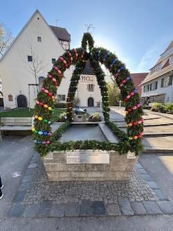 Am 12.04.2025 wurde in Maichingen ein ganz besonderes Ereignis gefeiert: die Einweihung des neuen Osterbrunnens im Rahmen der 950-jährigen Jubiläumsveranstaltungen. Der bunt geschmückte Brunnen, wurde von unserem Ortsvorsteher Herr Wolfgang Stierle feierlich eingeweiht. In seiner Ansprache betonte er die Bedeutung des Osterbrunnens als Symbol für den Frühling und die Gemeinschaft: „Dieser Brunnen steht nicht nur für die Osterzeit, sondern auch für den Zusammenhalt und die Traditionen, die unsere Gemeinde prägen.“