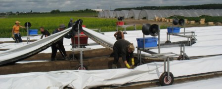 mit Spargel und 6 ha mit Erdbeeren bepflanzt sind. Die angestellten 120