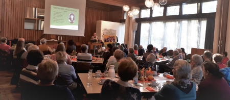 Dann folgte der Hauptteil des Vormittags durch Frau Johanna Schweigel, Bildungsreferentin des LandFrauenverbands Württemberg-Baden. Frau Schweigel begann ihren Vortrag zum Thema „100 Jahre Frauenwahlrecht – auf dem Weg zur Gleichberechtigung“ mit einem Rückblick auf die Anfänge der Frauenbewegung Mitte des 19. Jahrhunderts. Sie schilderte sehr unterhaltsam, mit welchen Schwierigkeiten, Verboten und weiteren Hindernissen die Frauen über 70 Jahre zu kämpfen hatten, bis dann endlich Friedrich Ebert in der Weimarer Republik das Frauenwahlrecht am 12.11.1918 in das Reichswahlgesetz integriert hat. Die TeilnehmerInnen zeigten sich durch verschiedene Fragen und kurze Diskussionen sehr interessiert.